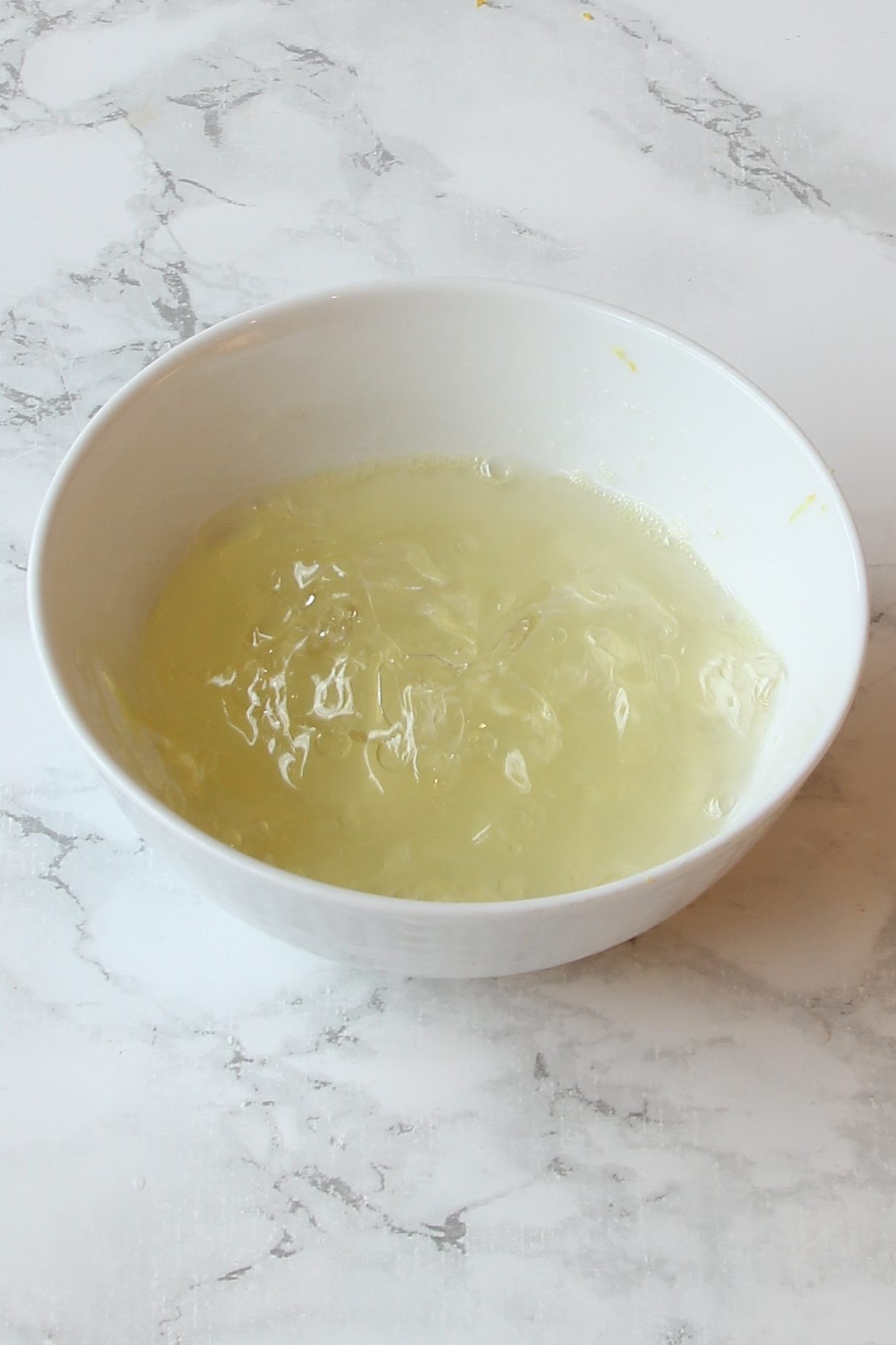 - Värm upp citronsaften snabbt i en kastrull eller mikron. Ta bort den från värmen och låt gelatinbladen smälta i saften. Låt blandningen svalna något och häll ner den i fyllningen. Blanda samtidigt med en visp.