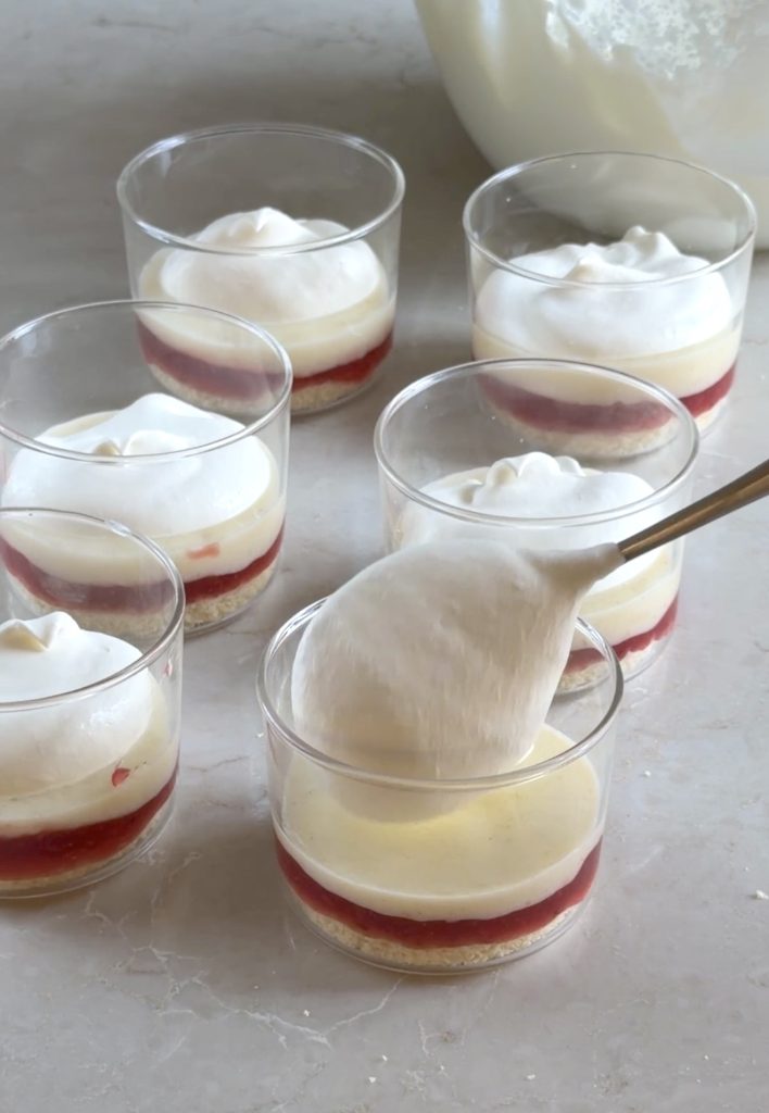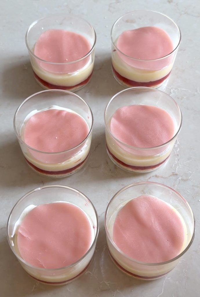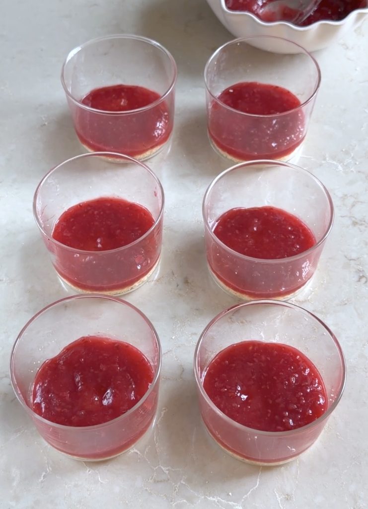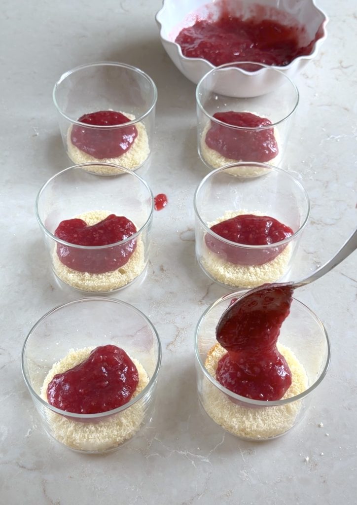 4. Lägg en sked hallonsylt ovanpå bottnarna i glasen. Bred ut sylten.