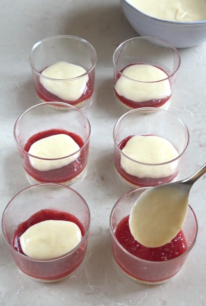 5. Lägg en sked vaniljkräm ovanpå sylten. Bred ut vaniljkrämen.