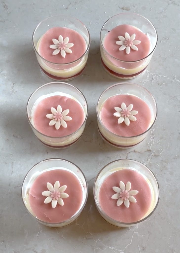 7. Stansa ut marsipanrundlar med glaset (samma diameter som glaset). Lägg dem försiktigt ovanpå vispgrädden. Forma gärna blommor av överbliven marsipan och garnera dina prinsesstårtor. Förvara dem i kylen tills det är dags att servera dem.