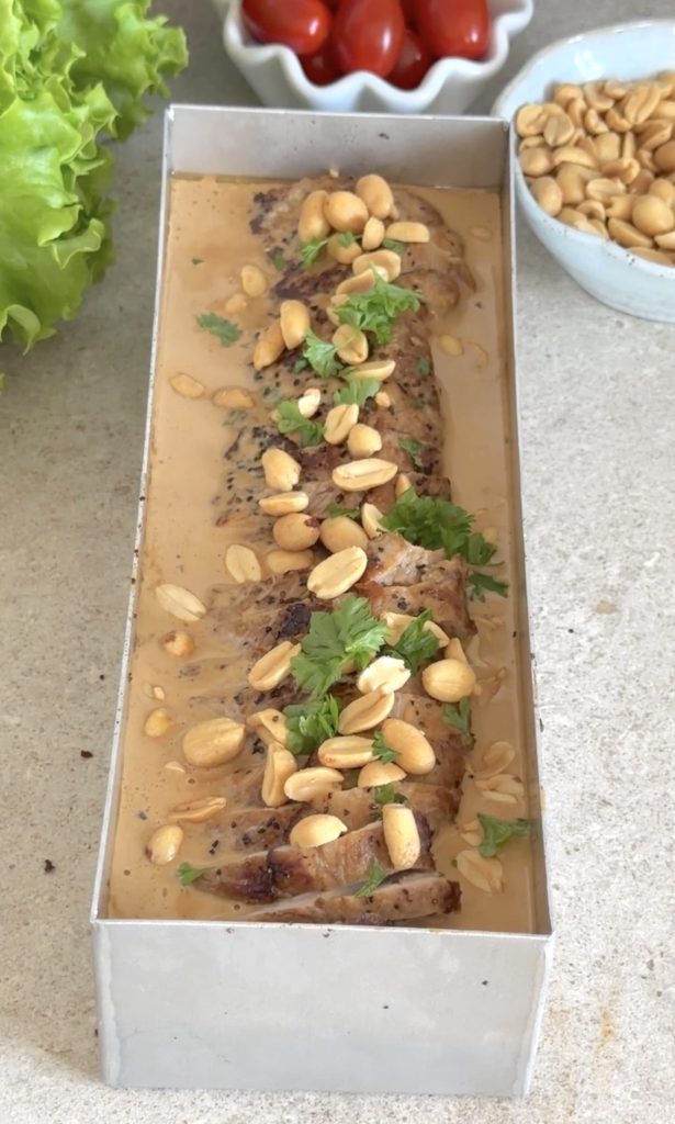 6. Skiva upp fläskytterflén i skivor, ca 1 cm tunna och lägg tillbaka dem i limpformen. Hälls såsen över köttet. Strö över en näve salta jordnötter.