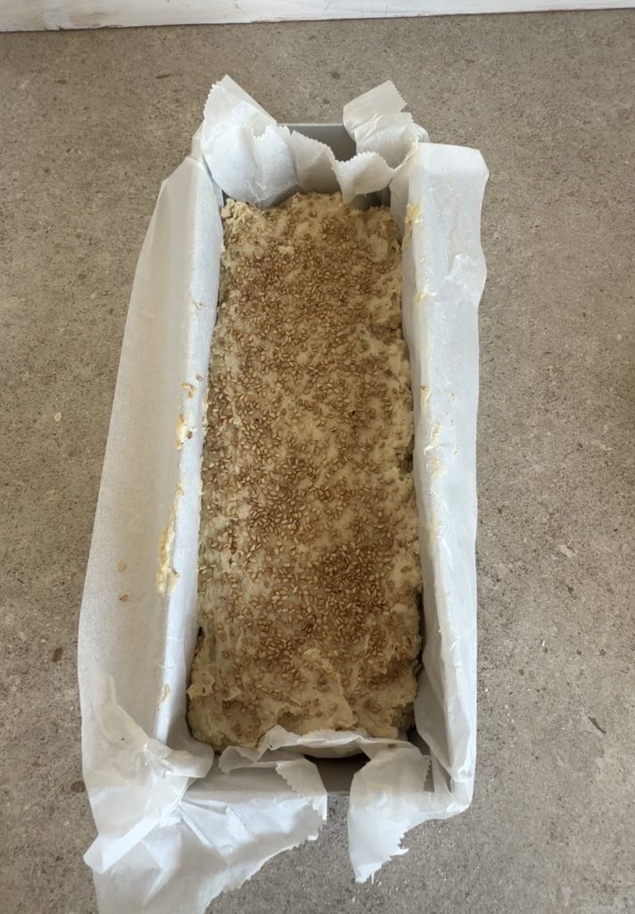 3. Stjälp upp brödsmeten i ugnsformen. Platta till ytan med en slev som du doppat i vatten. Strö över sesamfrön.